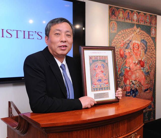 3月12日下午,香港佳士得举办的唐卡交接仪式上,中国藏家刘益谦正式接收“永乐御制红阎摩敌刺绣唐卡”。2014年11月26日,在经历了22分钟的激烈竞拍后,这件唐卡最终由刘益谦以3.48亿港元(超过2.78亿人民币)的价格为其在上海所创立的龙美术馆竞得,创下唐卡拍卖价格新纪录。