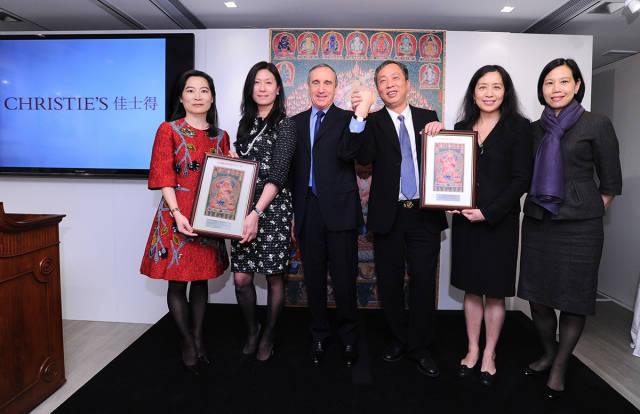 由左至右:佳士得亚洲区总裁(中国地区以外)魏蔚、龙美术馆创办人暨馆长王薇、佳士得亚太区主席高逸龙(François Curiel)、唐卡新主人及龙美术馆创办人刘益谦、佳士得中国区总裁蔡金青,以及香港佳士得中国瓷器及艺术品部部门主管曾志芬